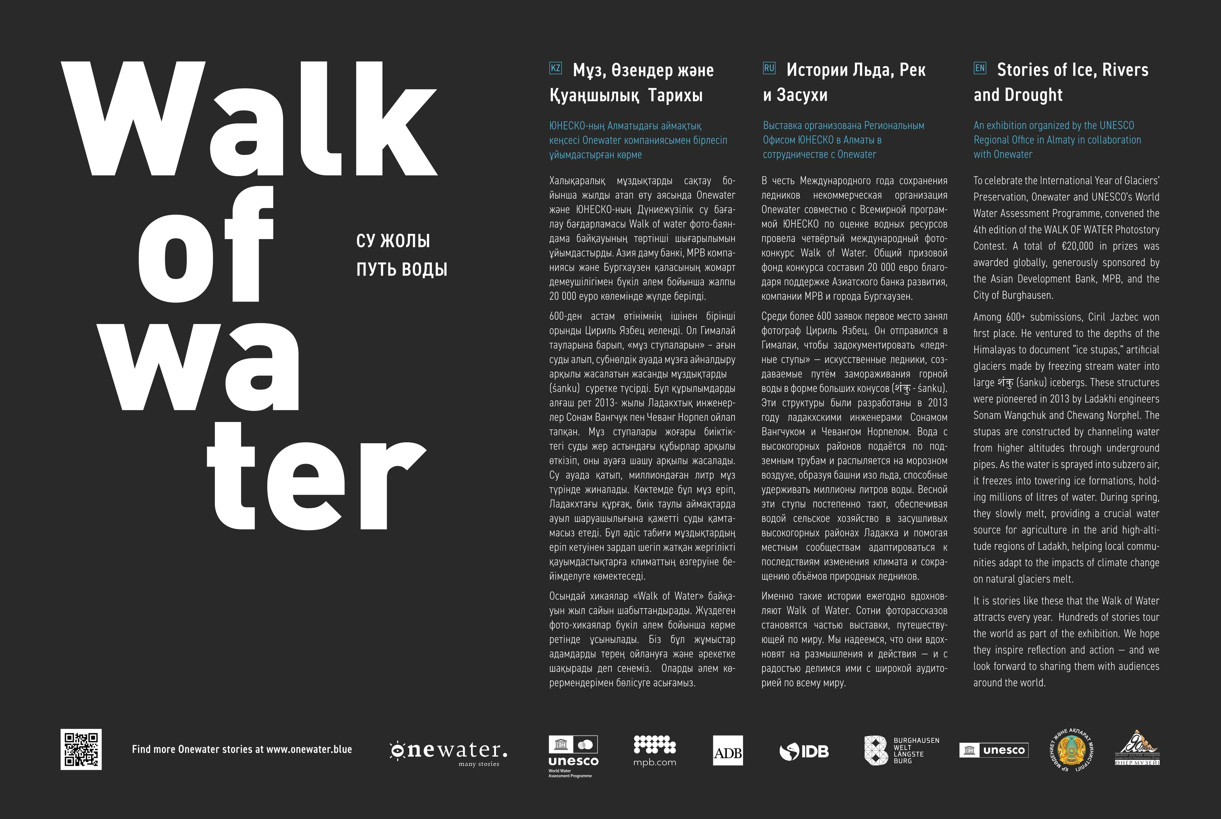 Organized by UNESCO Almaty Office in collaboration with Onewater, the Walk of Water exhibition at the Kasteev State Museum of Arts brings together powerful visual narratives from across Central Asia and around the world. Featuring award-winning photographs from the Water Towers and Water for Peace and Prosperity contests, the exhibition explores the many dimensions of water—from its role in sustaining ecosystems and livelihoods, to its cultural and emotional significance.